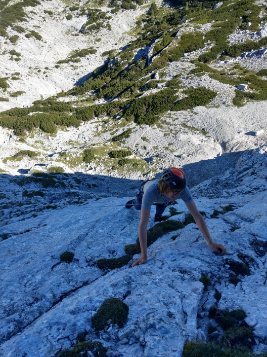 Je nach Fortschritt der Teilnehmer:innen und Wetter werden wir im Klettergarten oder direkt in der ersten Mehrseillänge das Gelernte vertiefen.